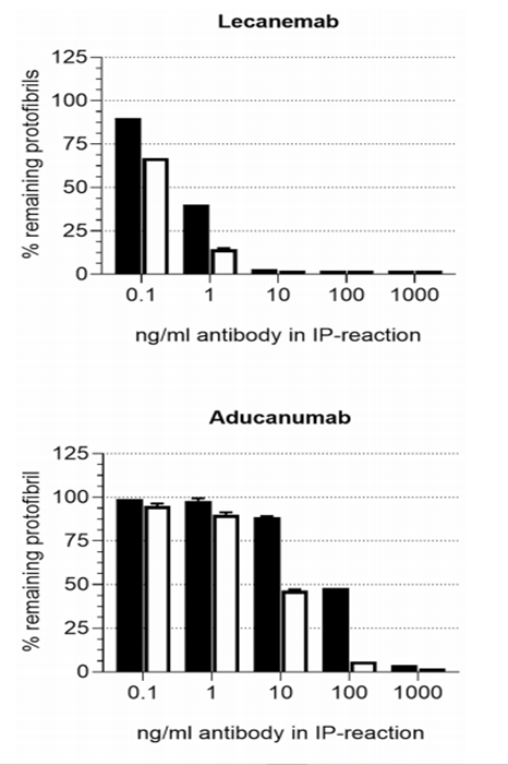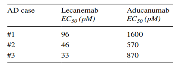 通过使用Lecanemab和Aducanumab去除大脑中的可溶性原纤维发现,Lecanemab的EC50明显小于Aducanumab,进一步证明Lecanemab去除大脑中的原纤维效果更好。也许这就是导致Lecanemab在III期临床效果与Aducanumab差异的原因。