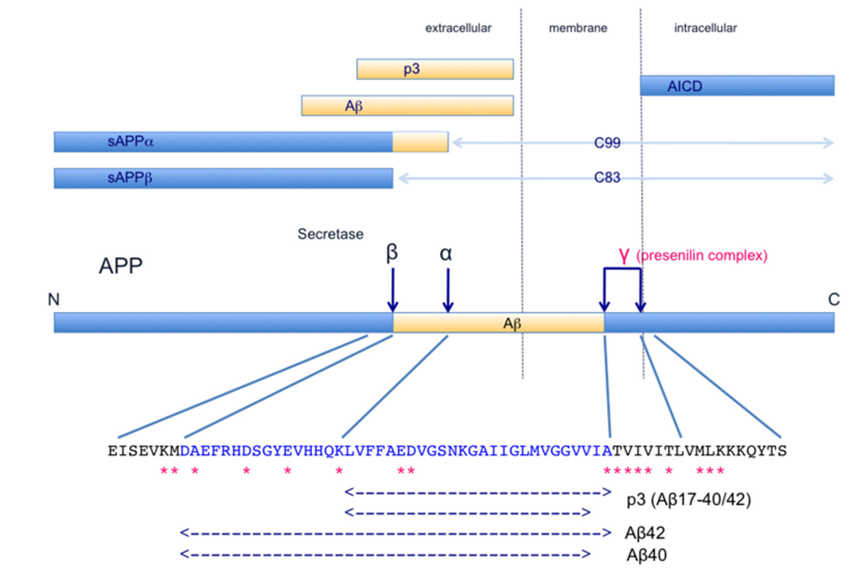 25年以来,淀粉样蛋白假说一直是AD疾病的主流机制,Aβ主要来源于APP,APP通过β-分泌酶和γ-分泌酶分解,形成Aβ,并释放至细胞外;在正常人,Aβ能够被快速分解和清除;然而在老年人或病理状态下的人,Aβ被降解的能力变弱,于是,Aβ多肽被聚集。Aβ多肽聚集的主要成分是两种多肽,一种是Aβ40,另一种是Aβ42,它们分别是含有40个和42个氨基酸的多肽,其中Aβ42的疏水性强于Aβ40,Aβ42的水平或者比例增加,会诱导Aβ淀粉样原纤维的产生;Aβ淀粉样原纤维的进一步累积发展成老年斑。这个老年斑会诱导tau蛋白病理变化,这些将会导致神经元死亡和神经退行性变。