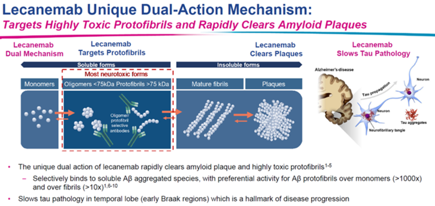 另外,根据相关文献报道,Lecanemab不但可以选择性结合Aβ低聚物,同时延缓Tau 病变 ,这一双重作用也让Lecanemab的效果更好。