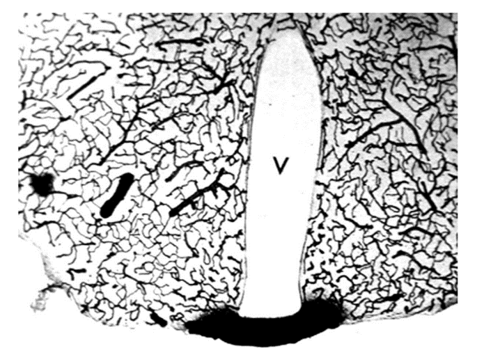 因此,研究认为Aducanumab在大脑中脑浓度几乎可以忽略不计,这就可能是它本身就困在脑血容量中,并没有穿过血脑屏障。那么问题来了,既然它不会穿过血脑屏障,那么它为什么有脑浓度?通过一项研究得知,静脉注射HRP后,小鼠大脑组织化学发现,HRP是一种40kDa的蛋白质,不会穿过血脑屏障,也不会进入大脑,除了大脑的微小区域,即缺乏BBB的室周区域,也就是说,大脑中还存在一种区域,这个区域是位于第三脑室底部的正中隆起处,下图是大脑这一区域对HRP的摄取,也许这就能够解释为什么Aducanumab在大脑中有一定脑浓度。