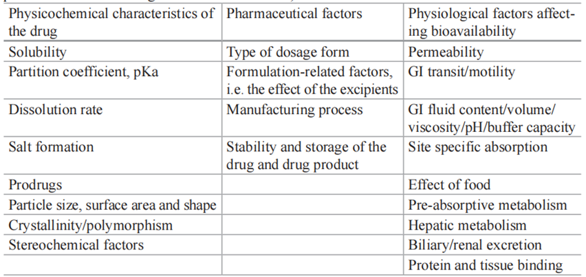 •药物通过胃肠道膜的渗透和吸收进入系统循环。这两个方面都很复杂,并取决于其他几个因素,包括:1.药物的理化性质;2.生理因素;3.配方因素。这些因素的主要特征总结如下表1。