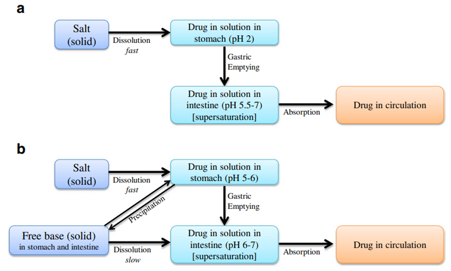 (a)在正常酸性胃pH条件下的药物吸收。(b)在升高的胃pH条件下的药物吸收。在胃pH升高时,药物以游离碱形式沉淀会导致药物溶出减慢。(参考3)