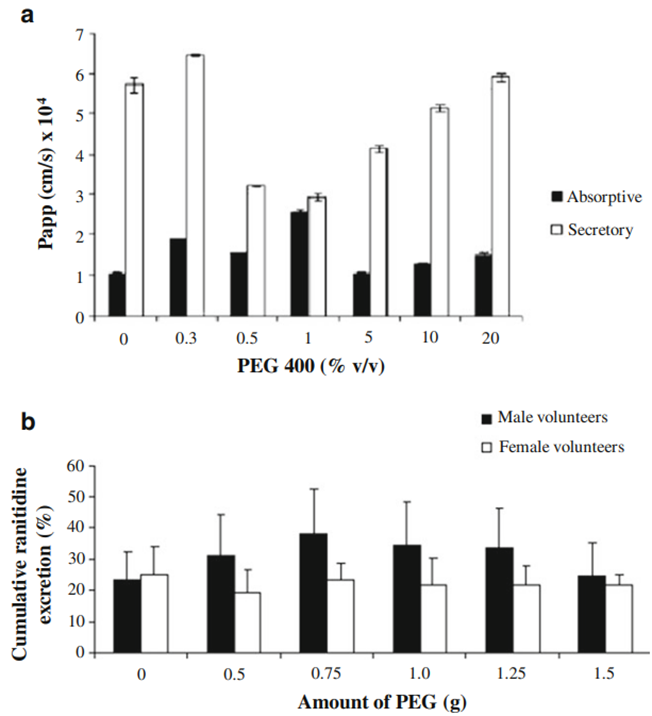 图3 PEG 400对雷尼替丁在Caco-2细胞单层中的双向转运的影响(a),以及对健康男性和女性志愿者在口服含有不同量PEG 400(b)的雷尼替丁水溶液后24小时内从尿液中排出的雷尼替丁量的影响。(参考3)