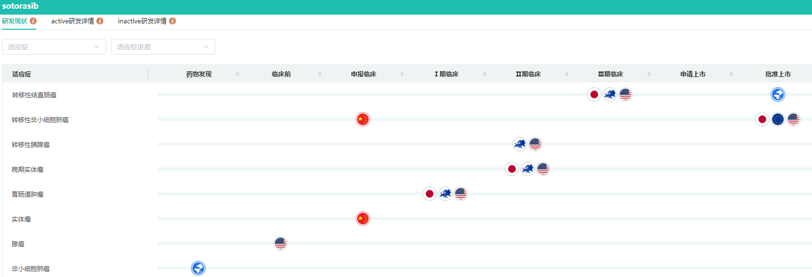 Sorasasib(AMG-510)是由安进公司研发的一种可逆且高选择性的小分子抑制剂,专门针对KRAS G12C突变。这一药物经过近40年的研究,终于成为首个获批的KRAS靶向疗法,并且是唯一一个被批准用于治疗KRAS G12C突变的局部晚期或转移性非小细胞肺癌患者的靶向药物。2021年1月,百济神州与安进的合作使得AMG-510(Sotorasib)被中国国家药品监督管理局(NMPA)列入“拟突破性治疗药物品种”。目前,AMG-510在国内正处于申请临床阶段。