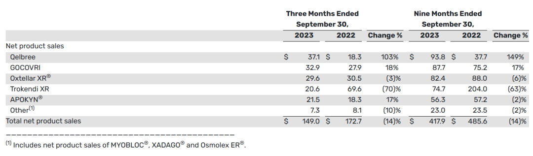 2023财年第三季度,Qelbree、Gocovri和Apokyn的产品净销售额增加,以及2023财年前三季度,Qelbree和Gocovri的产品净销售额增加,部分抵消了Trokendi XR产品净销售额的下降。与2022年同期相比,截至2023年9月30日的三个月和九个月的总收入(不包括Trokendi XR净产品销售额)分别增长了24%和25%。