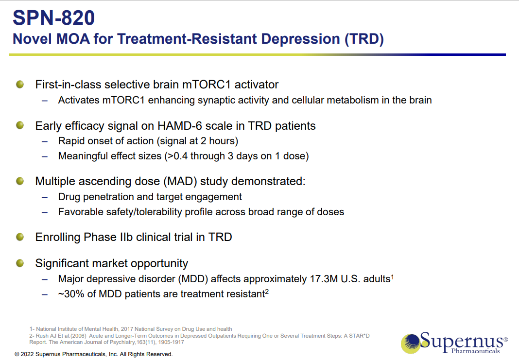 SPN-820治疗成人难治性抑郁症的IIb期多中心随机双盲安慰剂对照平行设计研究正在进行中。该研究将在多达50个临床地点的约268名患者中,在为期五周的治疗过程中检验SPN-820的疗效和安全性。主要结果指标是从基线到治疗结束时Montgomery-Asberg抑郁评定量表(MADRS)总分的变化。IIb期试验的背线数据预计将于2025年公布。