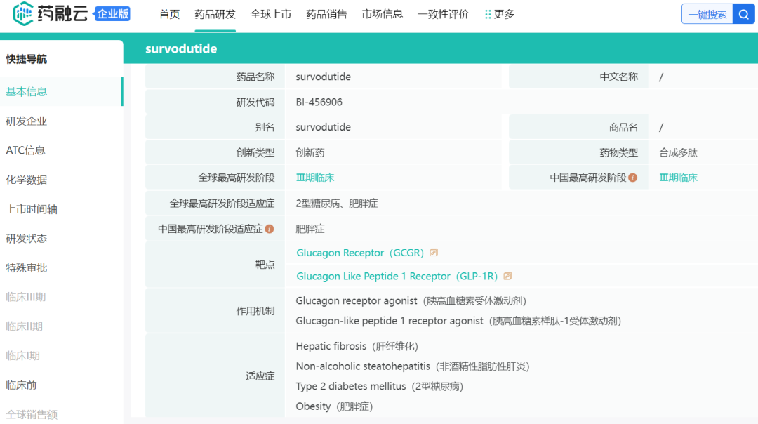 Survodutide(BI-456906)是一种由29种氨基酸组成的多肽,其结构衍生于胃泌酸调节素(OXM),具有对GCG(胰高血糖素)和GLP-1受体的双重激动作用。该候选药物由Zealand与勃林格殷格翰联合开发,由勃林格殷格翰负责临床开发和商业化。