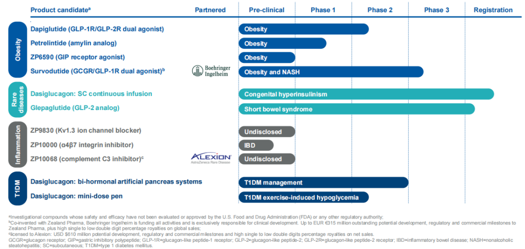 截至目前,Zealand的产品管线中已有10多款候选疗法进入临床研究阶段,其中2款已进入市场,3款候选药物处于临床后期开发阶段。同时,该公司与多家制药公司建立了开发合作伙伴关系,并就其已上市产品建立了商业合作伙伴关系。