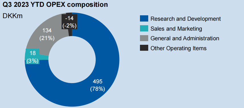2023年前三季度,Zealand总收入达到了3.196亿丹麦克朗(4632万美元),主要来自于勃林格殷格翰(Survodutide)、赛诺菲(利司那肽)的里程碑付款,以及诺和诺德[Zegalogue(Dasiglucagon)]的合作收入。同时,前三季度总运营费用为6.33亿丹麦克朗(9174万美元),略低于上一年,这是由于2022年3月宣布重组后,努力降低成本,以及一般管理费用下降,部分被更高的研发费用抵消,78%的运营费用分配给研发,这是由于临床后期罕见病项目的监管递交和肥胖管线的临床进展。