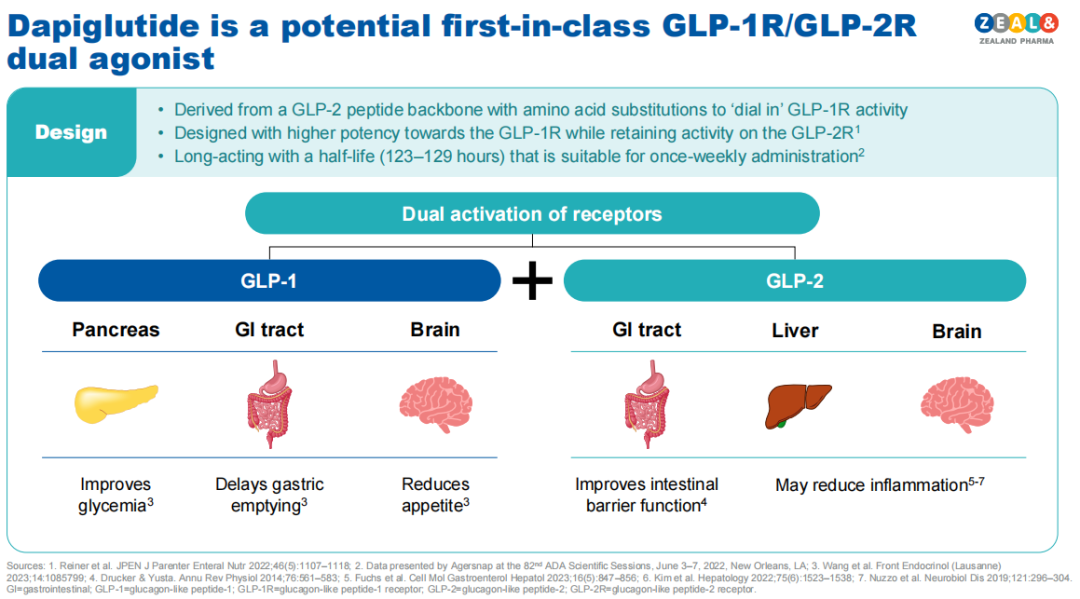 Dapiglutide是一款潜在first in class的长效GLP-1R/GLP-2R双重激动剂。1期临床研究显示,Dapiglutide在健康人群中可在四周内使平均体重减轻4.3%,其半衰期为123-129小时,有可能实现每周一次给药。