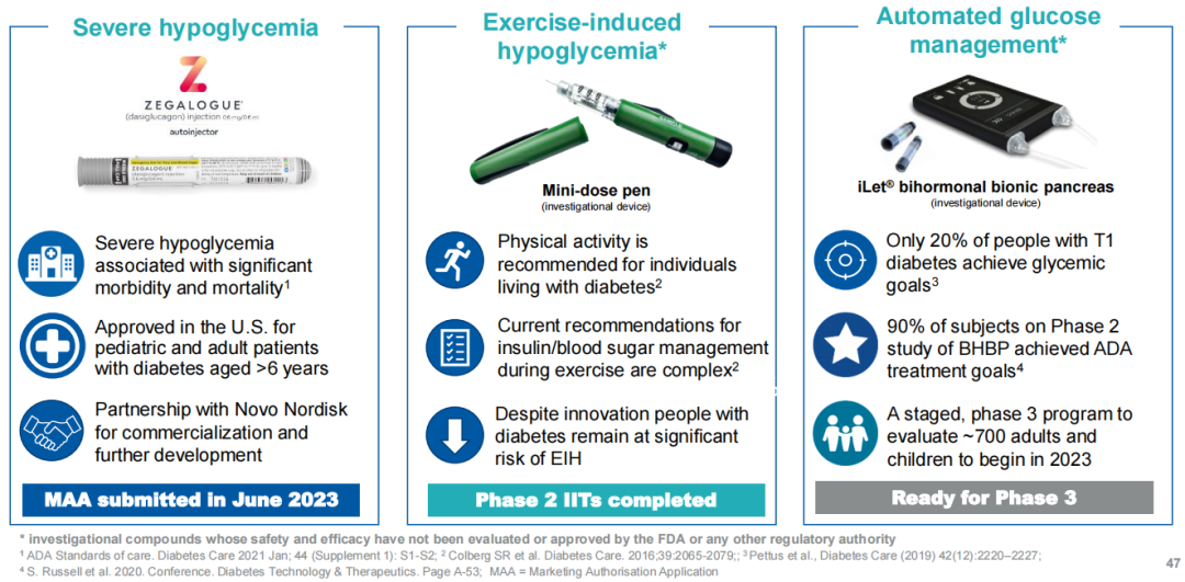 针对1型糖尿病(T1D),Zealand的目标是通过GLP-1类似物Dasiglucagon的应用来改变T1D疾病管理的范式,目前分别开发了用于严重低血糖、运动性低血糖、自动血糖管理的产品。