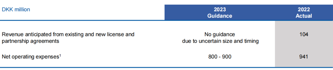2022年Zealand的许可和合作协议收入为1.04亿丹麦克朗(约1507万美元),运营开支为9.41亿丹麦克朗(1.36亿美元),预计2023年运营开支约为8-9亿丹麦克朗(1.16-1.3亿美元)。【汇率按照1美元=6.9丹麦克朗】