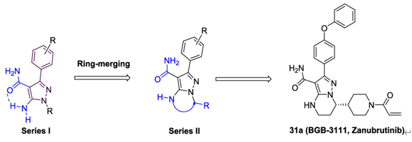 研发之初,研发人员将先导化合物变换氨基咪唑母核,得到了吡唑并苯并咪唑的衍生物,随后引入丙烯酰胺”弹头”,显著提高了化合物活性。将三环稠合的母核改为单键连出,可显著降低化合物刚性,有效改善药物药代动力学性质。由于过程中变换母核合成的吡唑并吡啶的化合物活性很低,遂变换母核为吡唑并哌啶,部分饱和化降低了分子的平面性,有利于位点结合。随后经过末端苯氧基的变换和携带迈克尔加成片段的结构变换,提高了抑制BTK的选择性抑制和化合物的生物利用度,并且降低了对EGFR的作用。先导化合物经过以上一系列的骨架演化,最终确定了泽布替尼的最终结构,并最终成功上市。