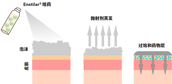 在耐压罐体中抛射剂呈液体状态,溶解度实验表明完全溶解处方量的卡泊三醇和丙酸倍他米松分别需要至少6%和11%的二甲醚,而最终泡沫气雾剂处方中的二甲醚用量为27%, 因此药物在处方中处于完全溶解状态。研发人员还考察了给药后泡沫中抛射剂含量随时间的变化关系,结果表明抛射剂蒸发迅速,2分钟内泡沫中的二甲醚和丁烷的含量仅为0.5%和4%。