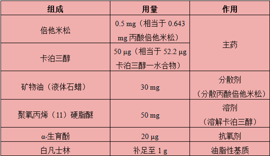 根据相关制剂专利(US6753013B1),1 g的卡泊三醇-丙酸倍他米松软膏的处方组成及用量如下表所示。需要注意的是,该表未列出辅料BHT,与Taclonex®软膏的处方组成存在冲突,但笔者在查阅资料过程中注意到LEO Pharma在欧盟和上市的Daivobet®和日本上市ドボベット®软膏(Dovobet®Ointment)均不含BHT,其余成分与Taclonex®软膏完全相同。