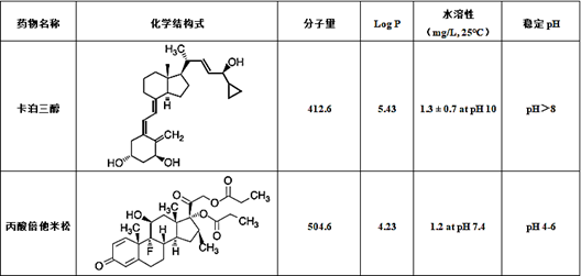 卡泊三醇易氧化,在酸性条件下不稳定,可以和醇发生反应,易发生差向异构化反应。丙酸倍他米松也易氧化,但是在酸性条件下稳定,而对碱不稳定。在水性环境中,卡泊三醇在pH>8时稳定性最好,而丙酸倍他米松则需要pH在4-6范围时最稳定。卡泊三醇和丙酸倍他米松的物理化学性质如下表所示。