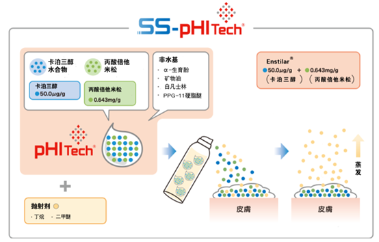 值得注意的是,Taclonex®软膏与Enstilar®泡沫气雾剂的活性成分及规格完全一致,处方成分的区别仅在于Enstilar®增加了抛射剂(二甲醚和丁烷),除此之外两者处方所用的辅料均相同。Taclonex®是基于LEO Pharma的pHITech®技术,所谓的pHITech®技术是英文“pH independent technology”的简称,即“非pH依赖技术”。Enstilar®泡沫气雾剂的成功上市则是基于LEO Pharma的SS-pHITech®技术,即“Supersaturation-pH independent technology”的简称,字面意思是“过饱和-非pH依赖技术”。