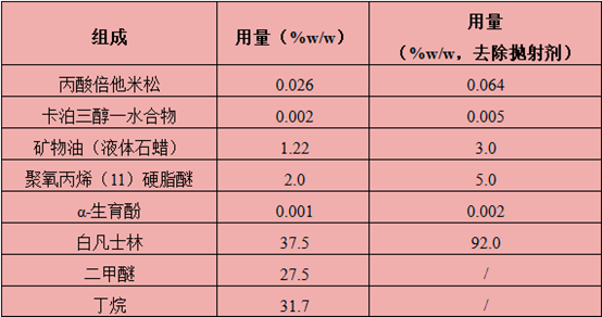 卡泊三醇-丙酸倍他米松泡沫气雾剂是在其软膏剂的基础上增加抛射剂改良而得。根据相关制剂专利(US9119781B2),其处方组成及用量如下表所示。同样需要注意的是,该表未列出辅料BHT,与Enstilar®泡沫气雾剂的处方组成存在冲突,LEO Pharma在日本上市的同类产品ドボベット®泡沫气雾剂(Dovobet®Foam)中不含BHT,其余成分与Enstilar®泡沫气雾剂完全相同。