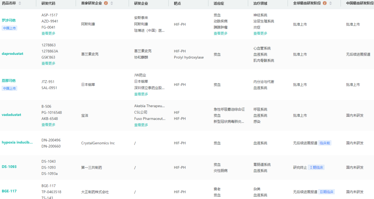 药融云数据库显示,截至目前,全球已有6款HIF-PH抑制剂上市,包括罗沙司他、恩那司他、伐达度司他(Vadadustat)、达普司他(Daprodustat)、莫立司他(Molidustat)、德度司他(Desidustat)。