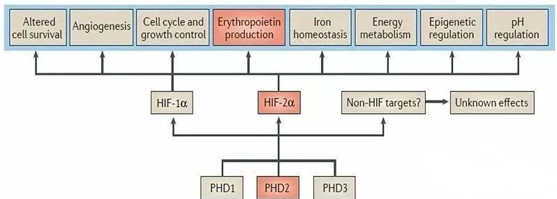 HIF-α的活性受到脯氨酰羟化酶(PHD)的调节,PHD有三种同工酶(PHD1、PHD2、PHD3),均可羟化HIF-α,HIF-α一旦被羟化就会被分解代谢。正常情况下,体内的PHD处于较高水平,可以促进HIF-α代谢,维持体内血红蛋白的稳定。而在低氧状态下,PHD的活性则会受到抑制,使HIF-α的水平增高,促进EPO等相关因子的表达上调。