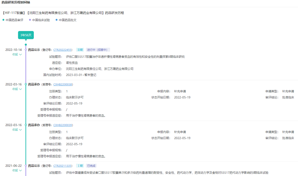 2021年6月,完成了评估中国健康成年受试者口服SSS17胶囊单次和多次给药剂量递增的耐受性、安全性、药代动力学、药效动力学及食物对SSS17药代动力学影响的I期临床试验。2022年3月,获批了(受理号:CXHB2200038)评估口服SSS17胶囊治疗非透析慢性肾病患者贫血的有效性和安全性的剂量探索II期临床研究;2022年10月,该临床试验(登记号:CTR20222455)启动患者招募。