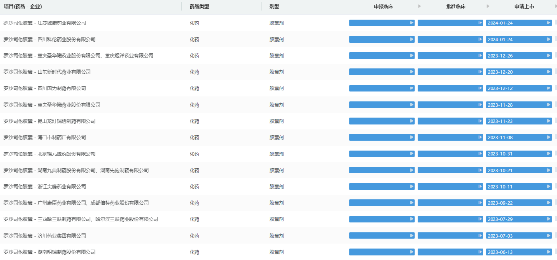 药融云数据库显示,国内已有23家企业提交了罗沙司他仿制药的上市申请,包括正大天晴、齐鲁制药、石药集团、科伦药业、倍特药业、福元医药、济川药业等,首仿争夺战早已箭在弦上。