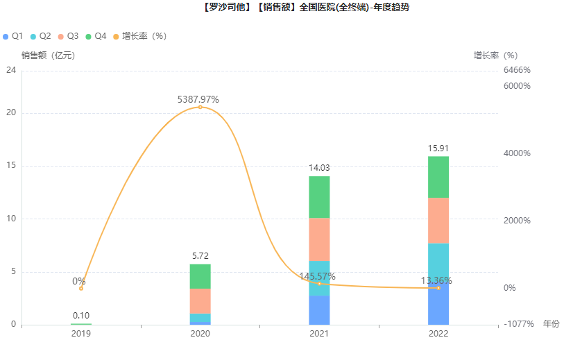 随着全球肿瘤和心血管疾病等低氧疾病的不断加剧,HIF-PHI药物有着非常广泛的应用前景和市场需求。全球首款HIF-PHI药物罗沙司他于2018年底在国内上市,2019年纳入医保后迅速放量。据药融云数据库统计,2020-2022年罗沙司他在全国医院终端市场的销售额分别同比增长5387.97%、145.57%、13.36%,2022年的销售额逼近16亿元。