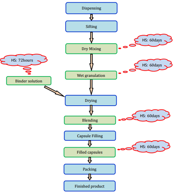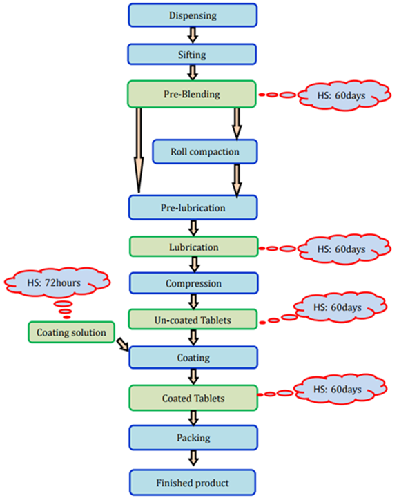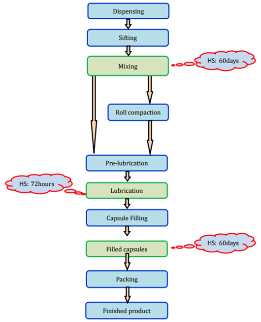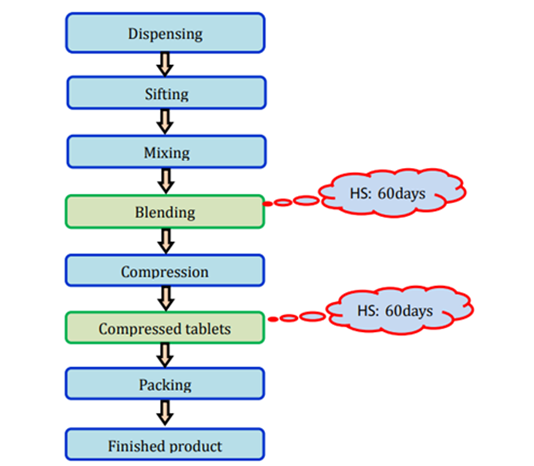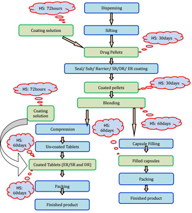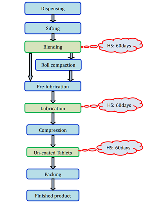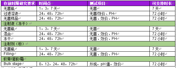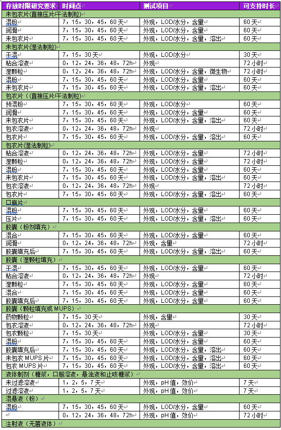 主要的存放时限研究阶段包括混合、搅拌、润滑、粘合剂溶液、包衣溶液、未包衣片剂、包衣片剂、填充胶囊、糖浆溶液、注射用粉末、液体注射剂、散装乳霜/软膏/凝胶。