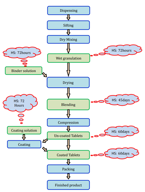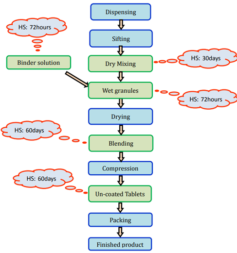 湿法制粒:制造工艺的详细信息和存放时限研究细节在图3和表2中表示。