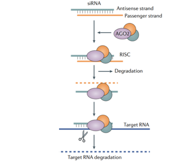 siRNA的作用机制是由Andrew Z. Fire和Craig C. Mello这两位美国科学家揭示,并在2006年获得诺贝尔生理学或医学奖。下图是siRNA的作用机制。
