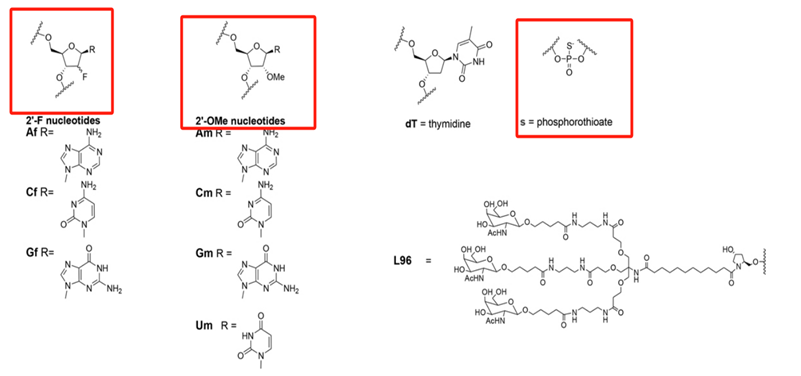 inclisiran在外切酶或内切酶的作用下易在血浆中被快速降解,为了提高化合物的稳定性,inclisiran将其分子结构中碱基进行了生化修饰,包含2′⁃氟和2′⁃甲氧基修饰,以及添加4种硫代磷酸盐,这几个结构的修饰,就像给它的分子结构穿上了防弹衣,使其在血液中更加稳定,减少伤亡。据文献报道,在inclisiran结构中添加这几种结构有以下几点优势:第一:增加药物的稳定性,防止降解;第二:增加酶抗性,减少药物被内切酶降解;第三:提高对靶RNA的亲和力;第四:降低免疫原性;目前,应用该结构修饰的药物不止inclisiran,还包括已上市的另外三款siRNA产品,分别为:GIVLAARI® (givosiran) 、OXLUMO® (lumasiran) 、AMVUTTRA®(vuttrisiran)。