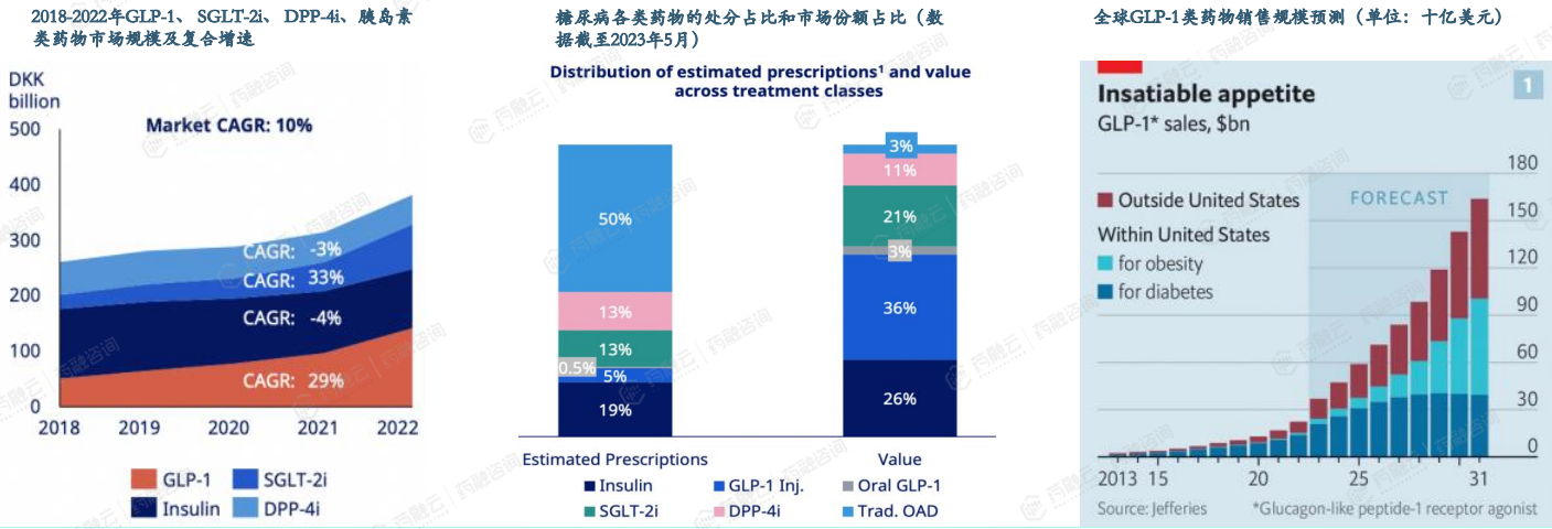 全球GLP-1RA市场规模已突破200亿美元,糖尿病领域市占率第一。全球糖尿病领域GLP-1RA市场份额已达39%,超胰岛素。根据诺和诺德公司财报,2018-2022年SGLT-2i及GLP-1RA市场规模分别保持33%、29%的CAGR,DPP-4i、胰岛素市场规模下降。截至2023年5月,尽管GLP-1类药物处方量渗透率仅5.5%(注射剂5%、口服0.5%),但糖尿病药物市占率已达39%(注射剂36%、口服3% ),超过胰岛素成为全球第一大糖尿病治疗药物类型。