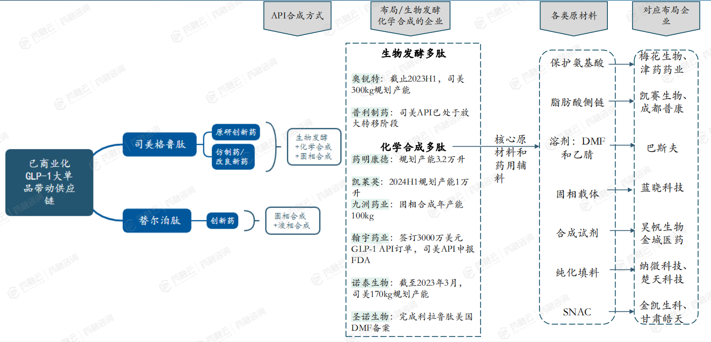 GLP-1上中下游产业链将受益于司美格鲁肽、替尔泊肽等大品种的快速放量。GLP-1产业链包括上游的原材料和设备以及原料药,中游的CDMO服务商以及下游的药物研发企业和注射笔等给药装置研发厂商。多肽药物分子大小介于小分子和大分子之间,大规模生产仍存在较高的壁垒,生产成本较高。目前全球司美格鲁肽等主流产品供不应求,给原料药供应商和CDMO提供了大量的机会。
