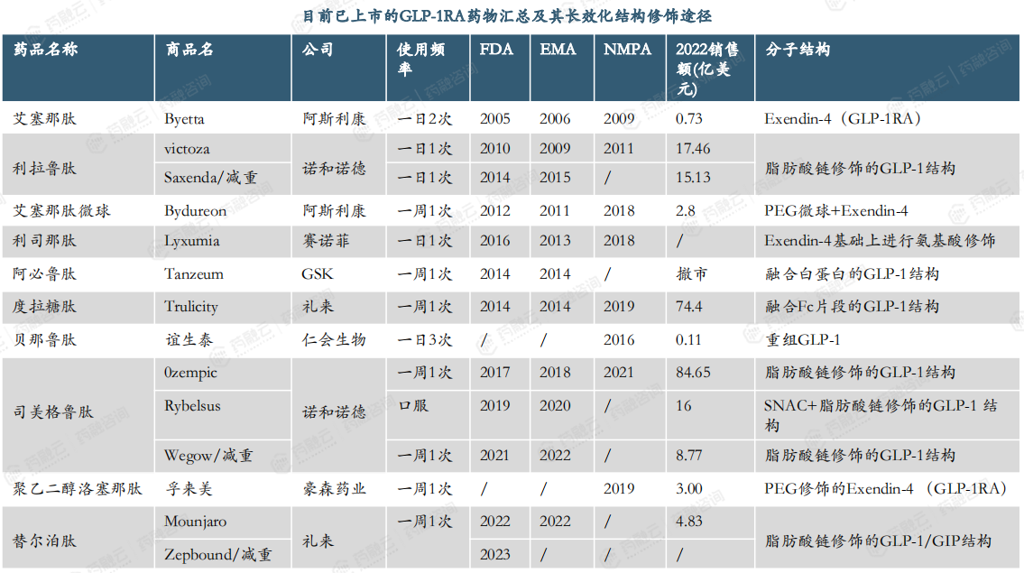 目前已上市的GLP-1RA药物汇总及其长效化结构修饰途径