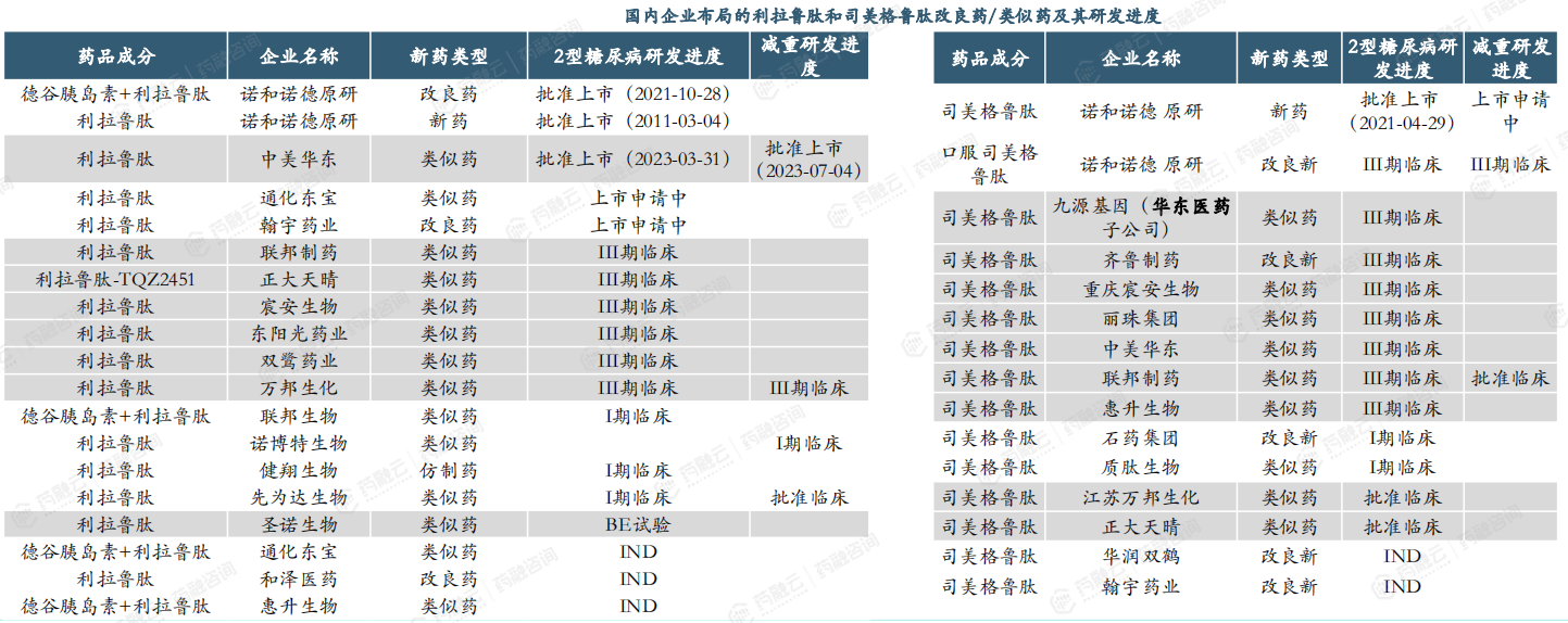 国内企业布局的利拉鲁肽和司美格鲁肽改良药/类似药及其研发进度