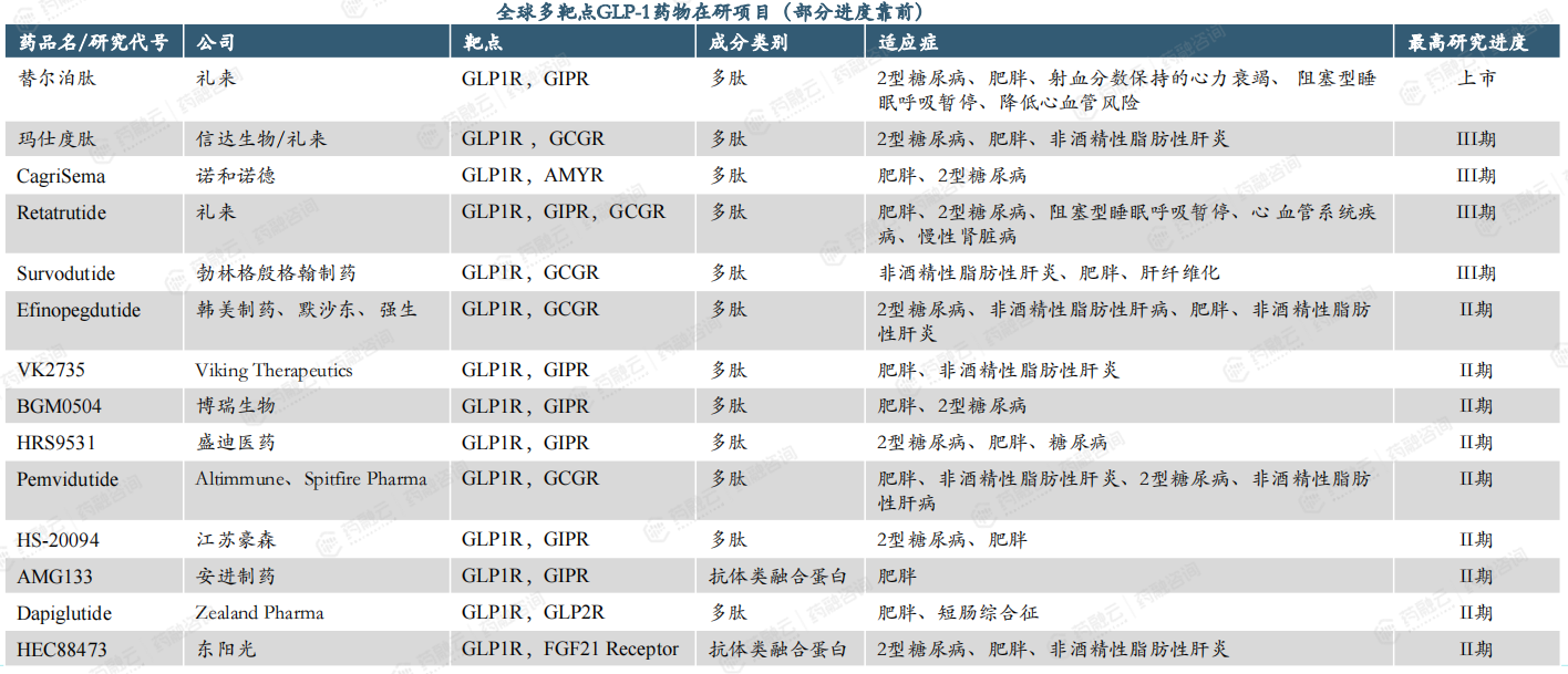 全球多靶点GLP-1药物在研项目(部分进度靠前)