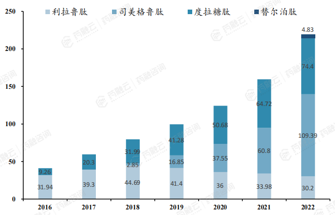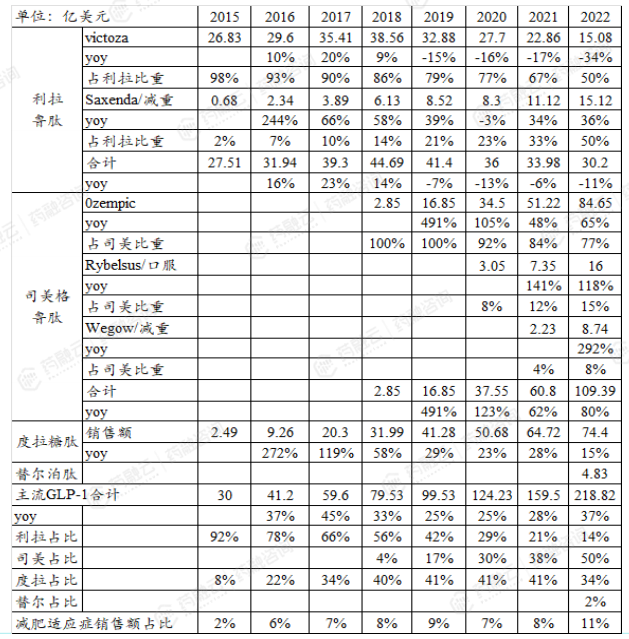 利拉鲁肽、司美格鲁肽、度拉糖肽、替尔泊肽历年全球销售额