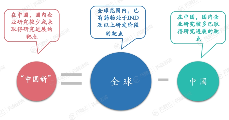 发现2023“中国新”靶点。用全球药物研发IND及以上的靶点除去中国药物IND及以上的靶点,得到 “中国新”靶点。靶点在全球范围内已经有药物处于IND及以上研发阶段,即在成药性上获得了一定的验证;排除国内在IND及以上药物涉及靶点,即国内还没有该靶点的药物处于IND及以上阶段。