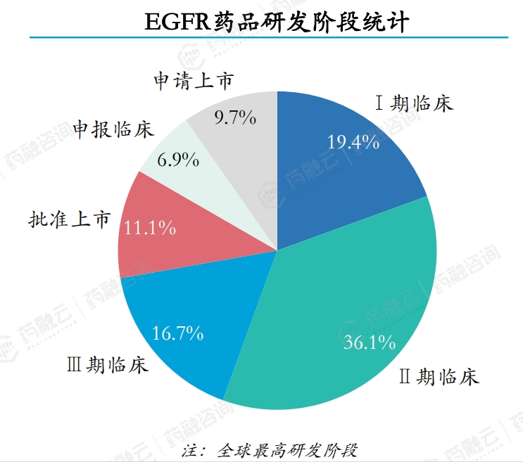 2018-2023期间,共计受理EGFR药品72个。EGFR药品中多数处于处于I期和II期临床研究阶段,I期和II期临床研究阶段药品数量共占比约55.5%,III临床及以上研发阶段药品共计19个,占比约26.4%。