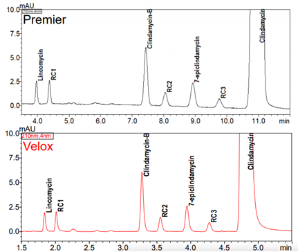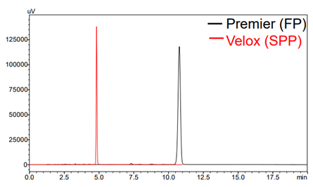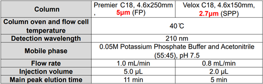 结论:对克林霉素盐酸盐的含量测定均可在FP和SPP柱上完成,色谱图的叠加显示SPP柱在相同的分析条件下具有更短的运行时间和更尖锐的峰。因此应用此系统有关物质和含量测定可以同时完成,节约50%的时间成本,如果选用SPP柱,效率会进一步提升一倍,综合使用可以节约3/4的时间。