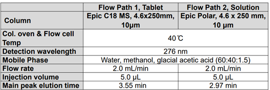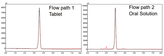 片剂的分析使用流路1完成,口服溶液的分析使用流路2完成。片剂和口服溶液中的API含量均在标示量的90-110%范围内。