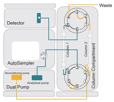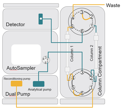 图 14 状态2上下同时自动切阀,色谱柱1切入平衡流路中冲洗,色谱柱2切入分析流路中直接用于下一针的样品分析。