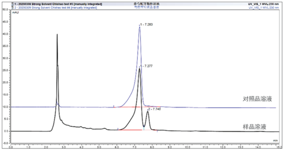 样品溶液制备溶剂为甲醇,而流动相则为甲醇-0.05mol/L磷酸二氢钾溶液(40:65),两溶剂体系极性差异较大,因此产生溶剂效应导致芍药苷主峰严重前沿且主峰与相邻未知成分峰分离度较差(见图16)