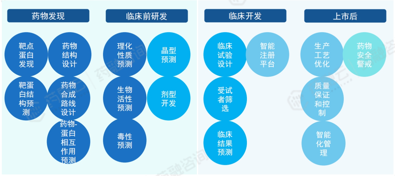 在药物研发阶段,传统的药物靶点识别、药物筛选、分子合成等方式周期长、成本高,因此AI在药物研发领域的应用最为广泛。AI在药物研发中可以通过数据挖掘、机器学习和深度学习等技术,加速药物发现和设计过程,提高研发效率和成功率。AI还可以在药物筛选中帮助挑选出具有潜在疗效的候选药物,降低研发成本和时间。在临床试验中,AI可以帮助优化试验设计、招募适合的患者群体,并提供数据分析和预测,加快药物上市进程。此外,AI还可以应用于药物生产中的质量控制、流程优化和智能化管理等方面,提高药物的生产效率和质量。