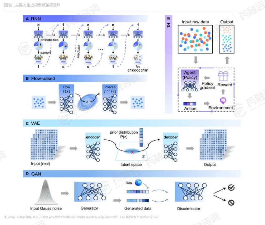 AI生成模型在全新药物设计中独具优势,无需先验化学知识,便能在广阔的化学空间中搜索并自动设计新颖分子结构。常用的深度生成模型包括基于RNN的模型、VAE和GAN等。然而,生成模型设计的分子结构多样且质量不一,强化学习则可通过微调模型参数,有针对性地优化分子特性,为全新药物设计开辟了新的道路。