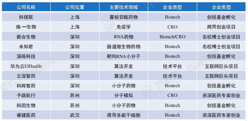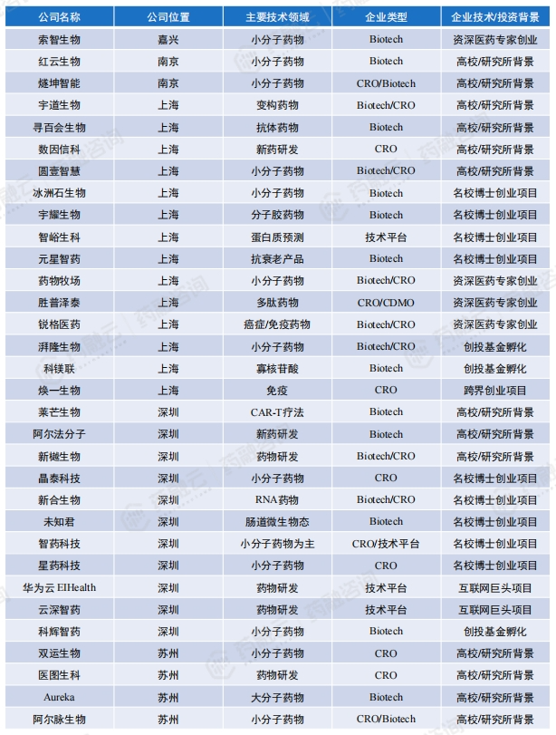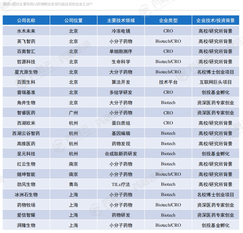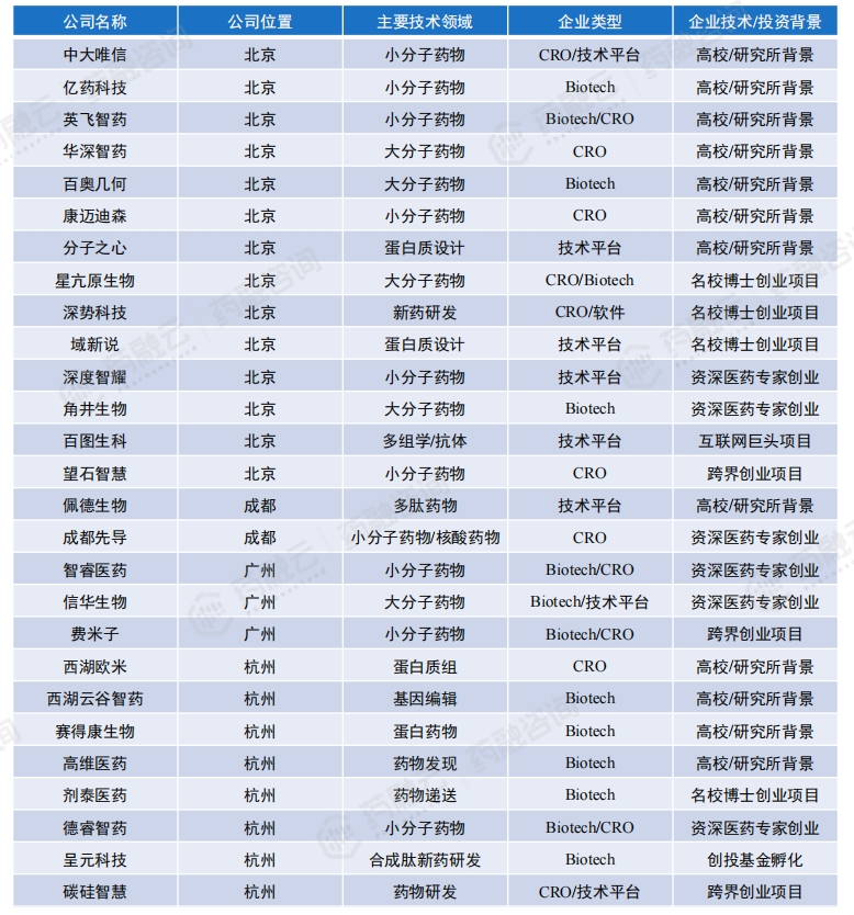 国内能够进行靶点发现的AIDD企业约32家,主要分布在北京、上海、深圳等地区,具体企业名称及布局技术领域,如下表所示。