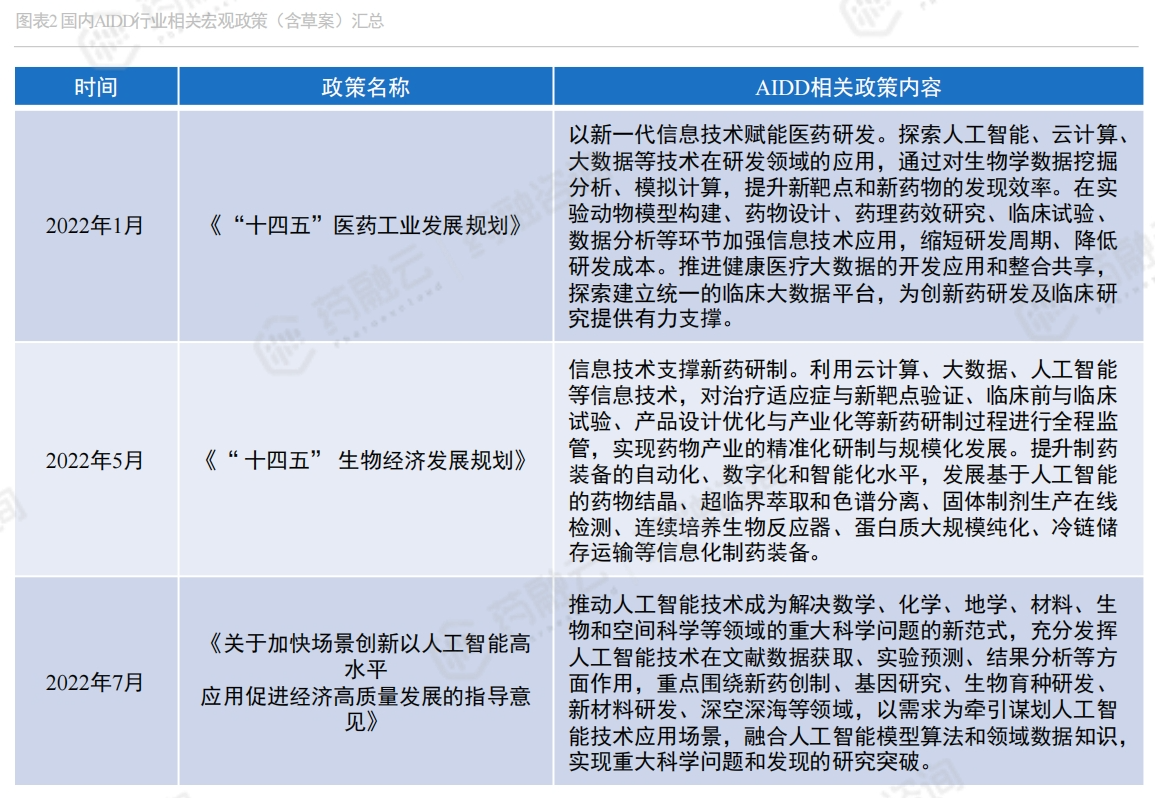 目前,国内AIDD行业相关政策起始于“十四五”时期,主要以政府宏观政策为主,相应的执行发展政策及监管政策,还需要随着国内行业逐步深入发展而进行细化、完善。