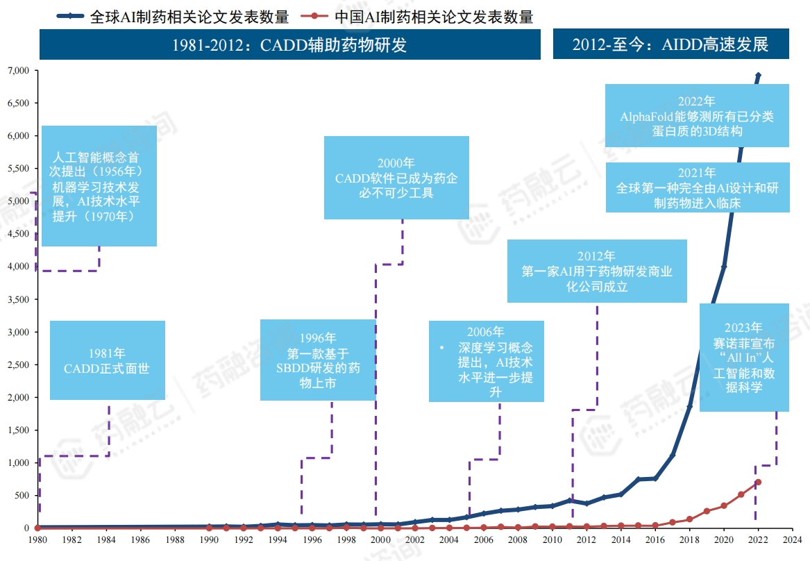 1956至1981年的技术积累期,早期构想因技术限制未能实现。1981年至2012年的计算机辅助药物设计(CADD)研发期,CADD虽能辅助药物发现,但并非核心,新药数量增长有限。