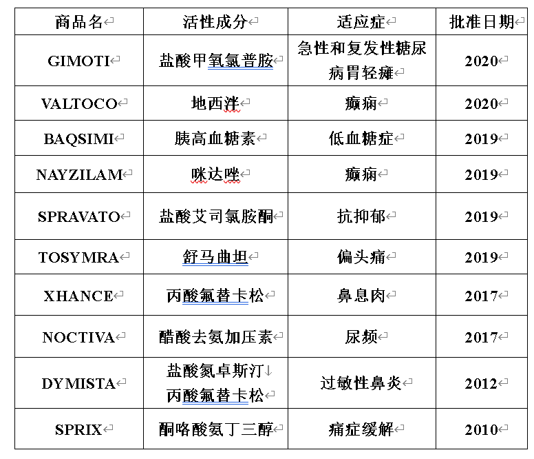 表1:2010年以来 FDA 批准上市的鼻腔药物