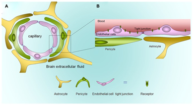 98%小分子和近100%大分子药物由于血脑屏障(blood-brain barrier, BBB)的存在而被限制进入中枢神经系统(central nervous system, CNS)发挥作用。BBB结构如下图所示,BBB阻止有害物质由血液进入脑组织保护我们的同时,也阻止了药物分子被摄取吸收,为神经和精神领域工作者提出了挑战。